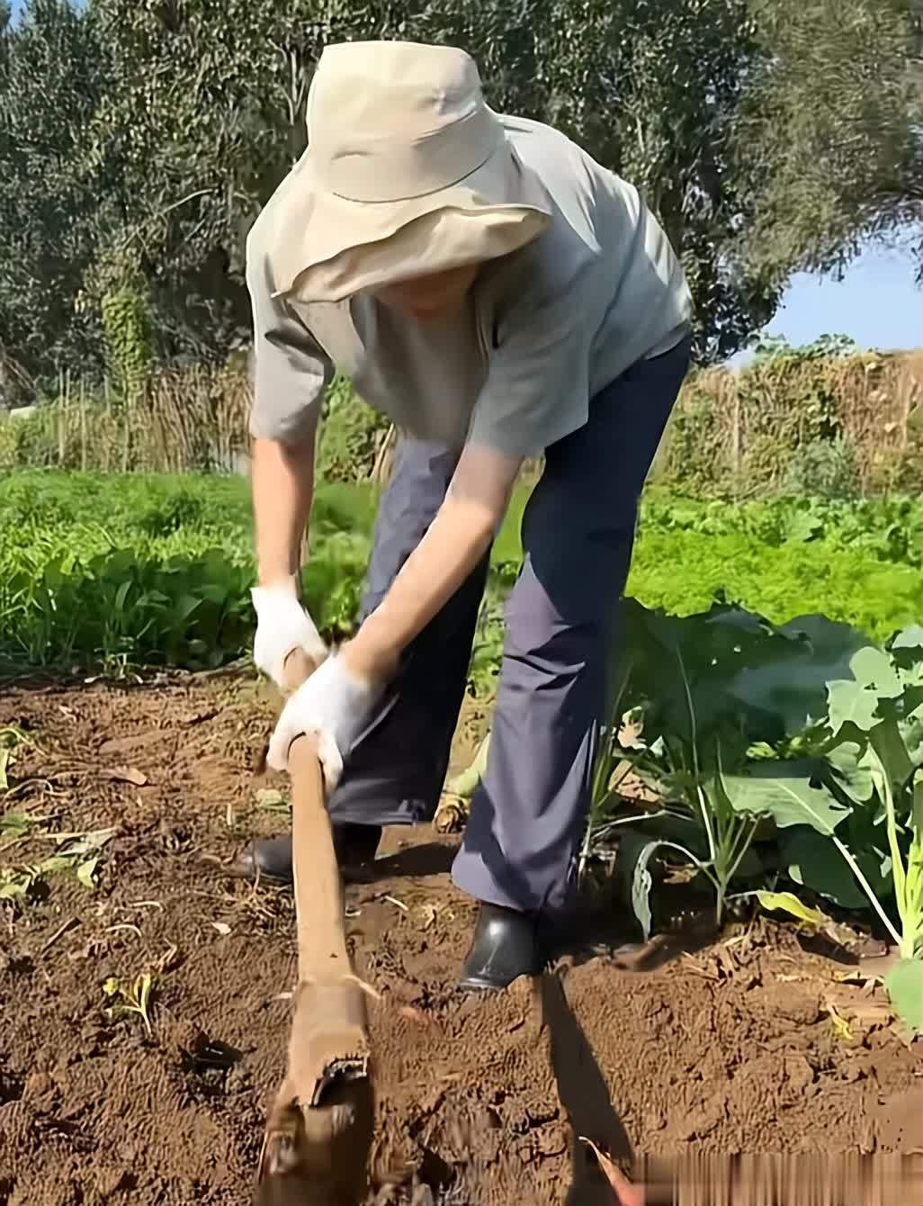 镜头里的她完全没有女明星的架子,穿着旧T恤和雨靴,徒手翻泥土,指甲缝里塞满了黑泥也毫不在意。